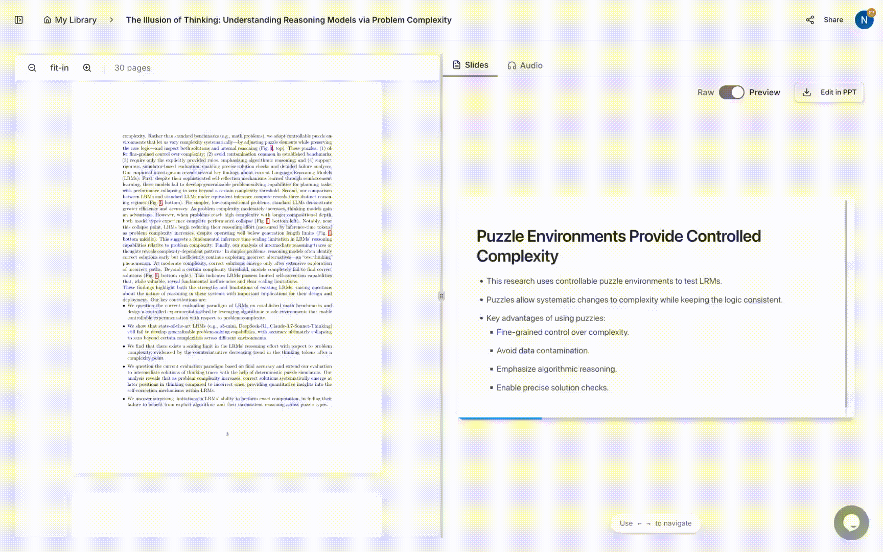 Upload any research paper and instantly transform it into the format you need. Skim with slides, listen on the go, or dive deep with notes.